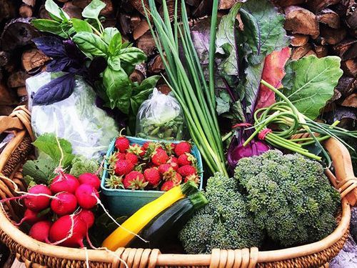 A basket with a variety of vegetables in season, certified organic (8 or more vegetables).