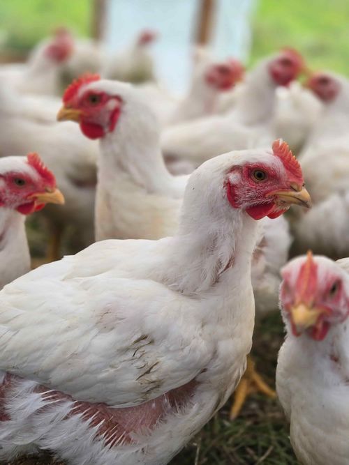 À la différence des poulets conventionnels élevés uniquement en bâtiment, nos poulets sont au grand air, picorent des insectes, de l'herbes et du gravier (utile à leur digestion) et peuvent exprimer ces comportements naturels au rythme de la lumière du jour. Nos volailles sont nourries uniquement avec de la moulée biologique et élevées durant l'été.
