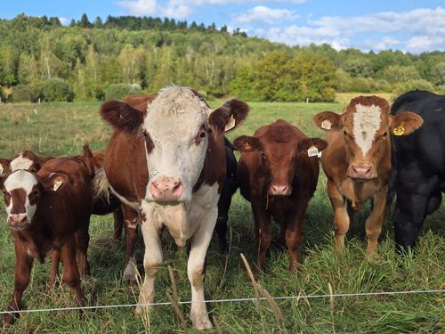 Nous élevons notre troupeau de bovins à l'extérieur toute l'année. Vaches, veaux et bouvillons broutent dans nos grandes prairies selon un système de pâturage tournant dynamique qui permet de préserver l’herbe et le sol et d’éviter le surpâturage. Nous tenons à une règle simple : une alimentation 100 % à l’herbe parce que la vache est herbivore avant tout et que c’est ce qui respecte le mieux sa digestion et sa nature. Enfin, nous suivons le rythme naturel du troupeau en planifiant les vêlages en mai et juin, lorsque les vaches peuvent profiter pleinement du pâturage.